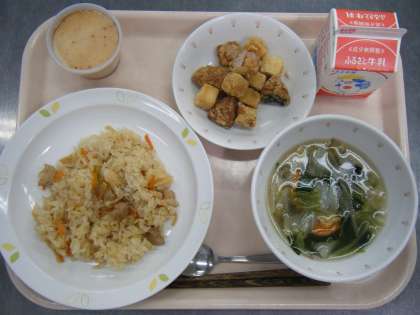 今日の給食は、中華おこわ、牛乳、魚と凍り豆腐のから揚げ、中華スープ、杏仁寒天です。