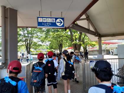4〜6年生は、電車の時間まで、少し日陰で待っています。