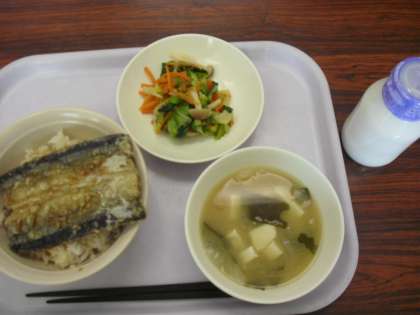 今日の献立は、さんまのかば焼き丼、牛乳、みそ汁、からしあえです。