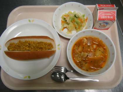 今日の給食は、大豆ドライカレーサンド、牛乳、ボルシチ、野菜のイタリアンドレッシングかけです。