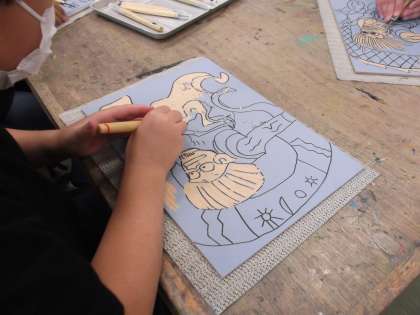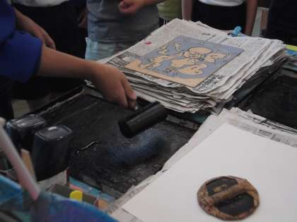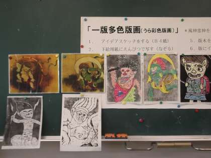 図画工作科では、オリジナルティあふれる風神雷神を描きそれを彫刻とで面彫りしています。どこを彫ることによって、美しく描くことができるのか考えながら黙々と彫り進めました。早く終わった子どもたちは、試し刷りにもチャレンジしました。