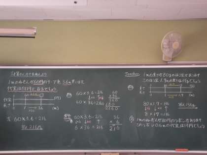 算数科の学習では、数直線を使って、計算を考えています。立式した意味を数直線を使ってうまく説明ができています。