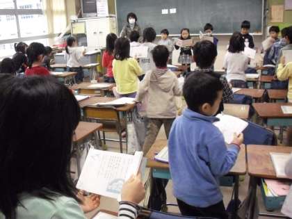 今朝は、“朝 読書タイム”・・・・時間まで真剣に読んでいました。そのあと、“朝の音読”・・・・1年生の始めから取り組んでいるので・・・リーダも自分の役割を理解して、早く前に出ています。
