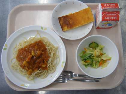 今日の給食は、スパゲッティ地中海ソース、牛乳、野菜のレモンじょうゆかけ、パインケーキです。