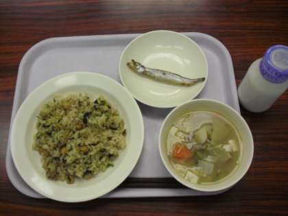 今日の献立は、ひよこ豆のまぜご飯、牛乳、豚汁、焼きししゃもです。
