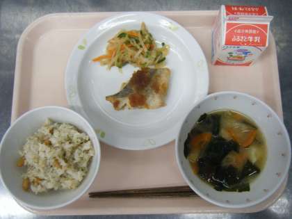 今日の給食は、豆ごはん、牛乳、魚のステーキソース、かみかみサラダ、みそ汁です。