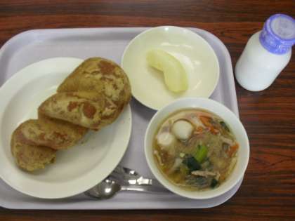 今日の献立は、揚げパン、牛乳、春雨スープ、くだものです。