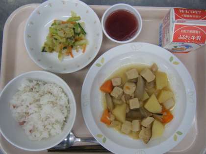 今日の給食は、梅じゃこごはん、牛乳、五目うま煮、野菜のおかかかけ、ぶどうゼリーです。