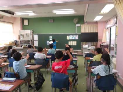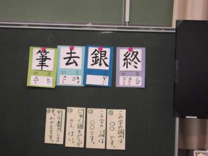 漢字の学習では、黒板の前に出て子ども同士で漢字を教え合っています。