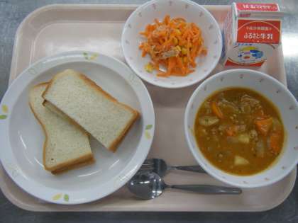今日の給食は、りんごジャムサンド、牛乳、ハンガリアンシチュー、にんじんサラダです。