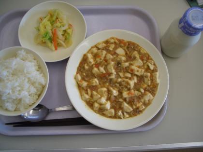 今日のメニューは、ごはん、牛乳、麻婆豆腐、辣白菜です。