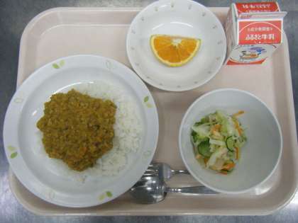 今日の給食は、キーマカレーライス、牛乳、フレンチサラダ、くだもの(オレンジ)です。