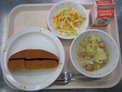 今日の給食は、セサミサンド、牛乳、ポトフ、マカロニとキャベツのサラダです。