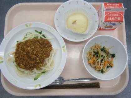 今日の給食は、ジャージャーうどん、牛乳、塩ナムル、米粉のりんご蒸しパンです。