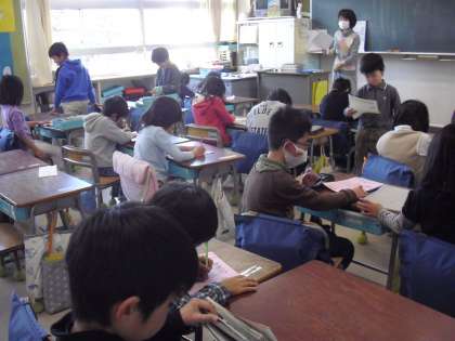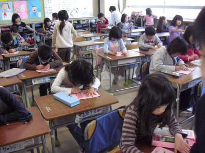 今朝の“マラソン集会”で走った周をマラソンカードに書いていました。“私は、○○周・・僕は、○○周”・・・と楽しそうに話していました。