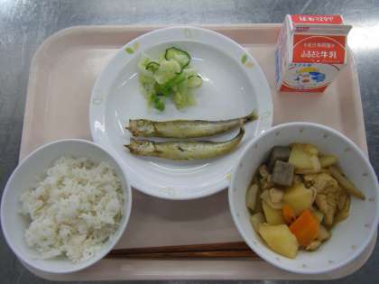 今日の給食は、麦ごはん、牛乳、ししゃものカレー焼き、筑前煮、野菜のひとしおです。