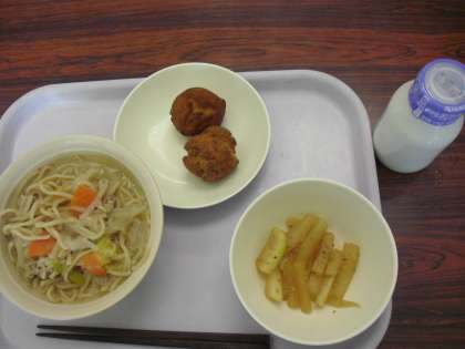 今日の献立は、味噌ラーメン、牛乳、サツマイモのドーナツ、大根の中華風です。