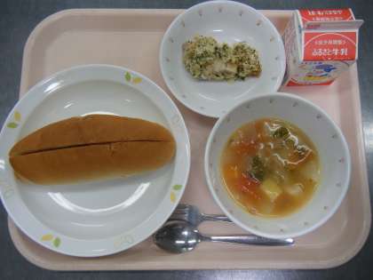 今日の給食は、いちごジャムサンド、牛乳、魚のマスタード焼き、ミネストローネです。