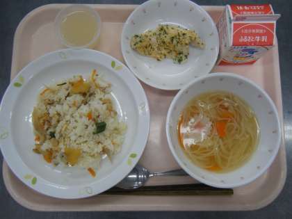 天の川や機織りの糸に見立てたそうめんや星をイメージしたおくらやなると、かまぼこなど、七夕の風習を取り入れた七夕給食です。