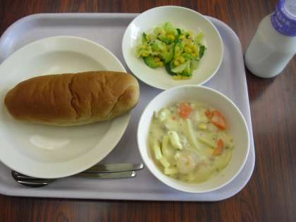 今日の献立は、黒ざとうパン、牛乳、マカロニのホワイトとソースあえ、コーン入りのフレンチサラダです。