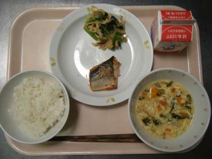 今日の給食は、麦ごはん、牛乳、さばの七味焼き、カリカリ油揚げと野菜のひたし、かきたま汁です。