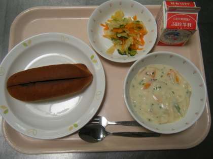 今日の給食は、きな粉バターサンド、牛乳、シシリアン、野菜のイタリアンドレッシングかけです。