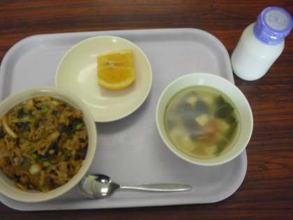 今日の献立は、キムチ丼、牛乳、わかめスープ、くだものです。
