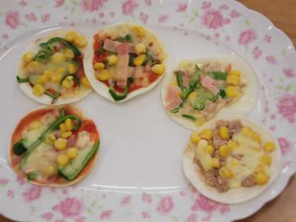 家庭科の学習で餃子の皮を使ったピザを作りました。
