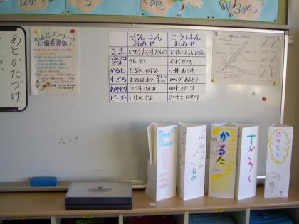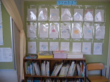 右画面は、「サケのたまご」の観察カードがありました。たまごから稚魚になるまでの観察記録が掲示ビニール袋の後ろに入っています。図書コーナーも使いやすくなっています。