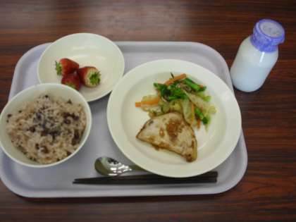 今日の献立は、“お楽しみ献立”です。6年生の卒業と他の学年の子どもたちの進級を祝う・・・献立です。画面の他に雪見大福かアイスクリームがつきました。
