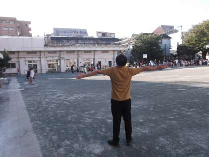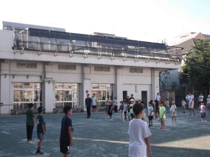 前に立ち、ラジオ体操の見本を示してくれる子どもたち。