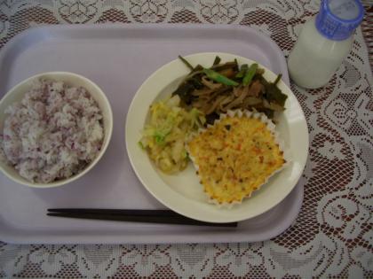 今日のメニューは、ゆかりごはん、牛乳、擬製豆腐、くきわかめのきんぴら、白菜のおかかかけです。
