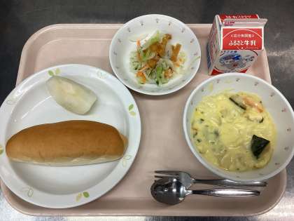 今日の給食は、国産小麦コッペパン、牛乳、パンプキンシチュー、パリパリサラダ、くだもの(なし)です。