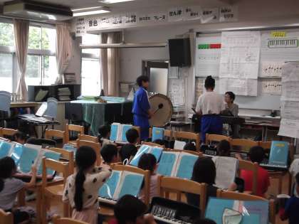 2年生の音楽の授業では、大太鼓と小太鼓で中学生たちがリズムをとっています。