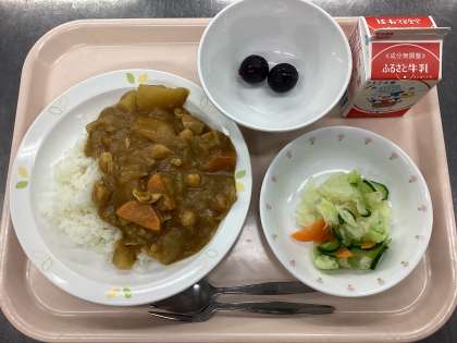 今日の給食は、ひよこ豆のカレーライス、牛乳、ひとしお野菜、くだもの(巨峰)です。