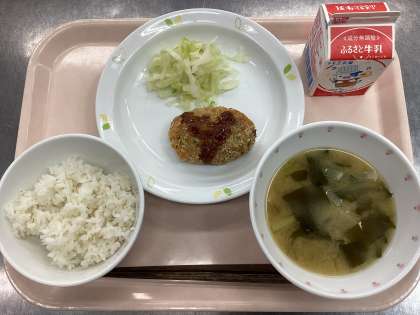 今日の給食は、麦ごはん、牛乳、ひじき入りコロッケ、キャベツソテー、みそ汁です。