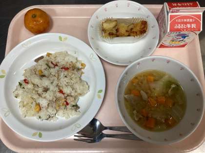 今日の給食は、ピラフ、牛乳、じゃがいものマヨネーズ焼き、野菜スープ、くだもの(冷凍みかん)です。