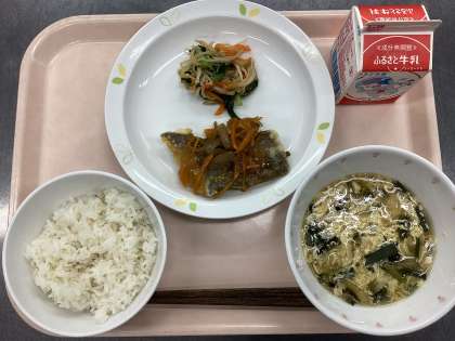 今日の給食は、麦ごはん、牛乳、魚の甘酢あんかけ、きのこ入りおひたし、にらたま汁です。