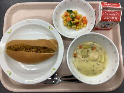 今日の給食は、ドライカレーサンド、牛乳、クリームスープ、トロピカルサラダです。