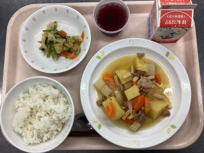 今日の給食は、麦ごはん、牛乳、肉じゃがうま煮、キャベツのおかかがけ、ぶどうゼリーです。