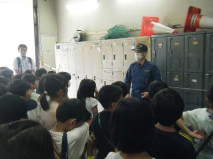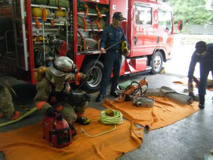 消火活動については、消防車に積んでいる道具の役割を知りました。最後に防火服やボンベなど全てを装備する所を見せていただき、現場に早く駆けるために日頃から訓練をしていることが分かりました。