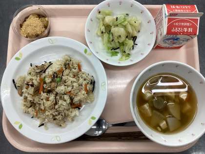 今日の給食は、五目ごはん、牛乳、けんちん汁、キャベツの塩昆布がけ、月見だんごです。