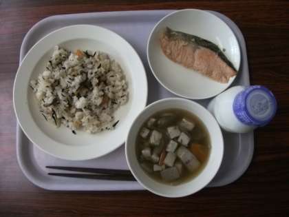 今日の給食は、ひじきごはん、魚の照り焼き、けんちん汁、牛乳です。