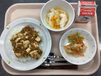 今日の給食は、麻婆豆腐丼、牛乳、中華サラダ、杏仁豆腐です。