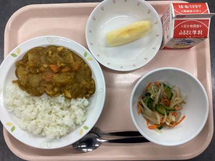 今日の給食は、カレーライス、牛乳、和風サラダ、くだもの(りんご)です。