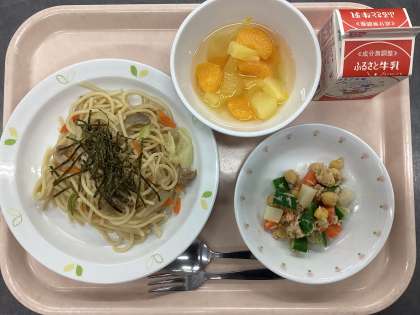 今日の給食は、和風スパゲティ、牛乳、ビーンズサラダ、フルーツポンチです。