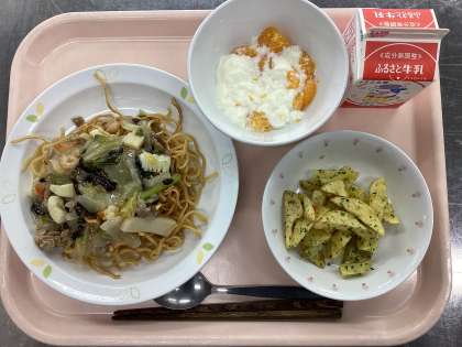今日の給食は、五目あんかけそば、牛乳、フライドポテト、みかんヨーグルトです。