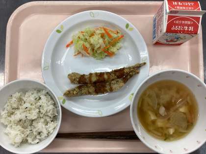 今日の給食は、わかめ入り麦ごはん、牛乳、ししゃものフライ、添え野菜、豚汁です。