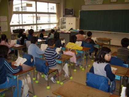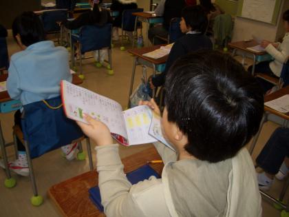 2年生は、先生が来るまでに“歌の練習”「君を のせて」を全員が声をそろえて歌 っていました。CDのメロディーにあわせて、とてもきれいな声でした。
