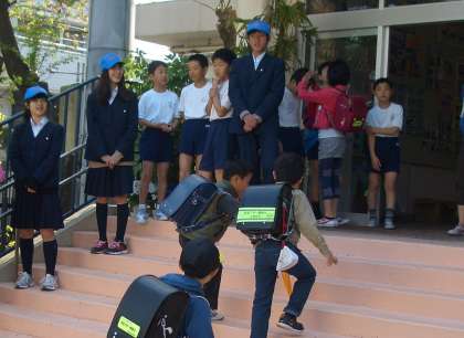 昨日、さぎそう学舎の八幡中学生の生徒会の3名が、本校のあいさつマンとして来校してくれました。大きなお兄さん・お姉さんから、「おはよう」と声をかけてもらえて、元気に1日がスタートできました。